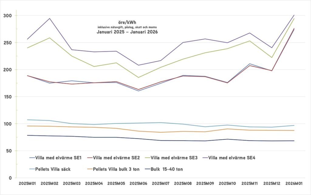 Elpriset varierar kraftigt och är generellt högre på vintern när energi för uppvärmning behövs som mest. Priset för pellets är mer stabilt mellan olika månader. Från januari 2025 till januari 2026 har pelletspriset sjunkit med 11 procent för pellets i säck och 10 procent för pellets levererad som minst 3 ton bulk. I januari 2025 låg priset på 97 öre per kWh för pellets i säck. Månadspriset för el låg i januari 2026 på cirka 288 öre per kWh el i elområde SE3, en skillnad på hela 191 öre per kWh.